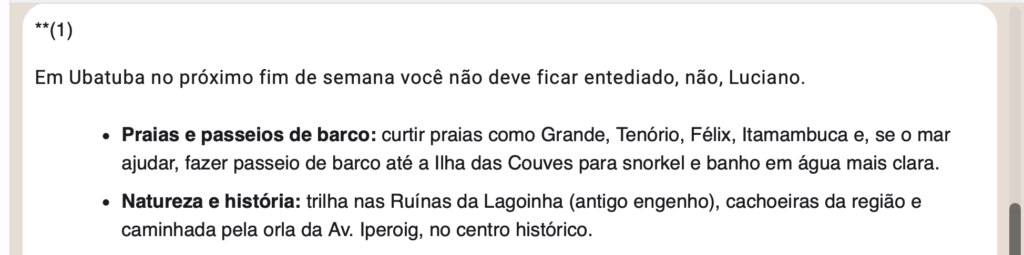 Em um caso como este, como ele não sabe te responder, ele vai procurar na internet as informações sobre. a cidade de Ubatuba e eventos no próximo fim de semana e te responder. Você não precisa pedir pra ele buscar na internet ou nada assim.